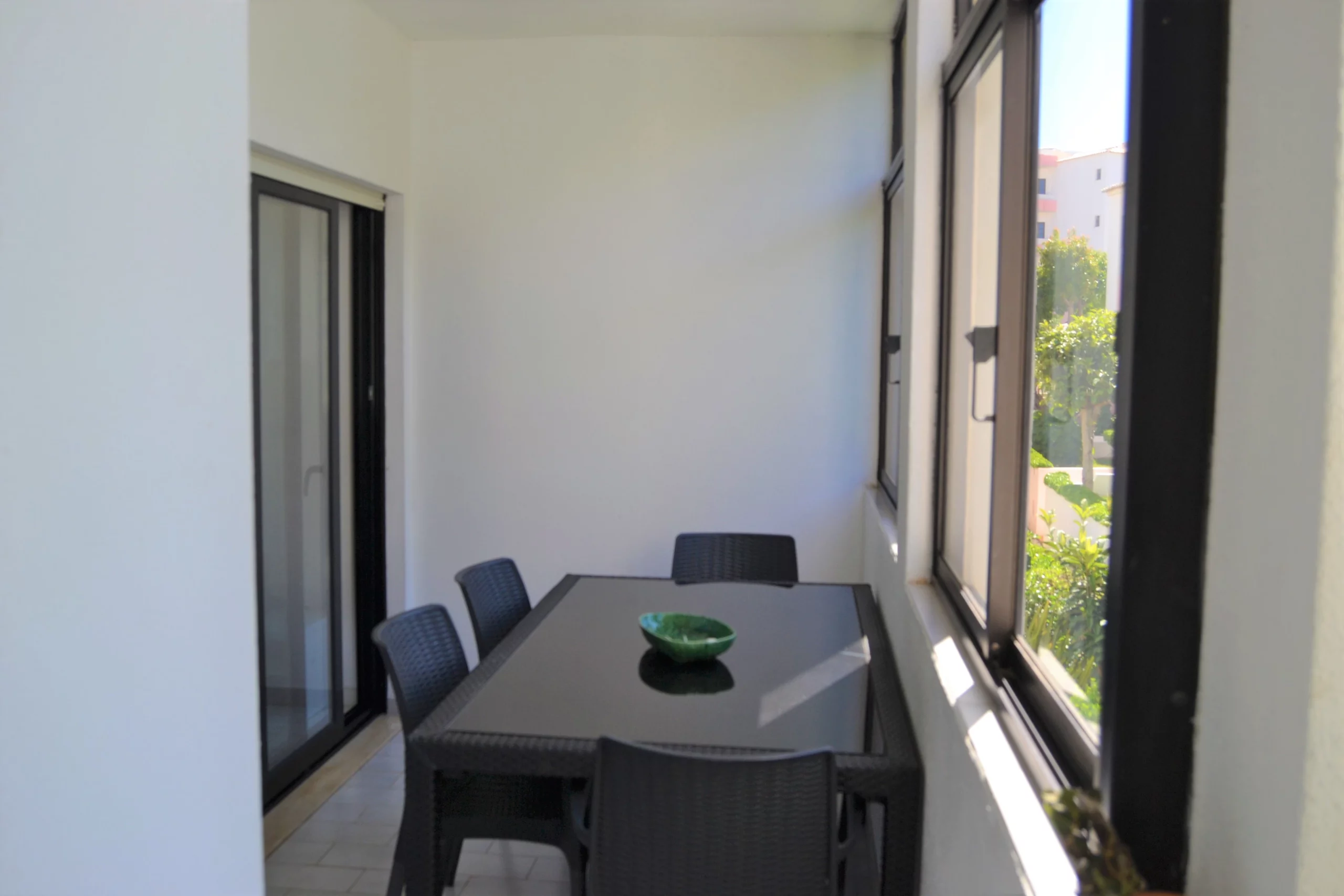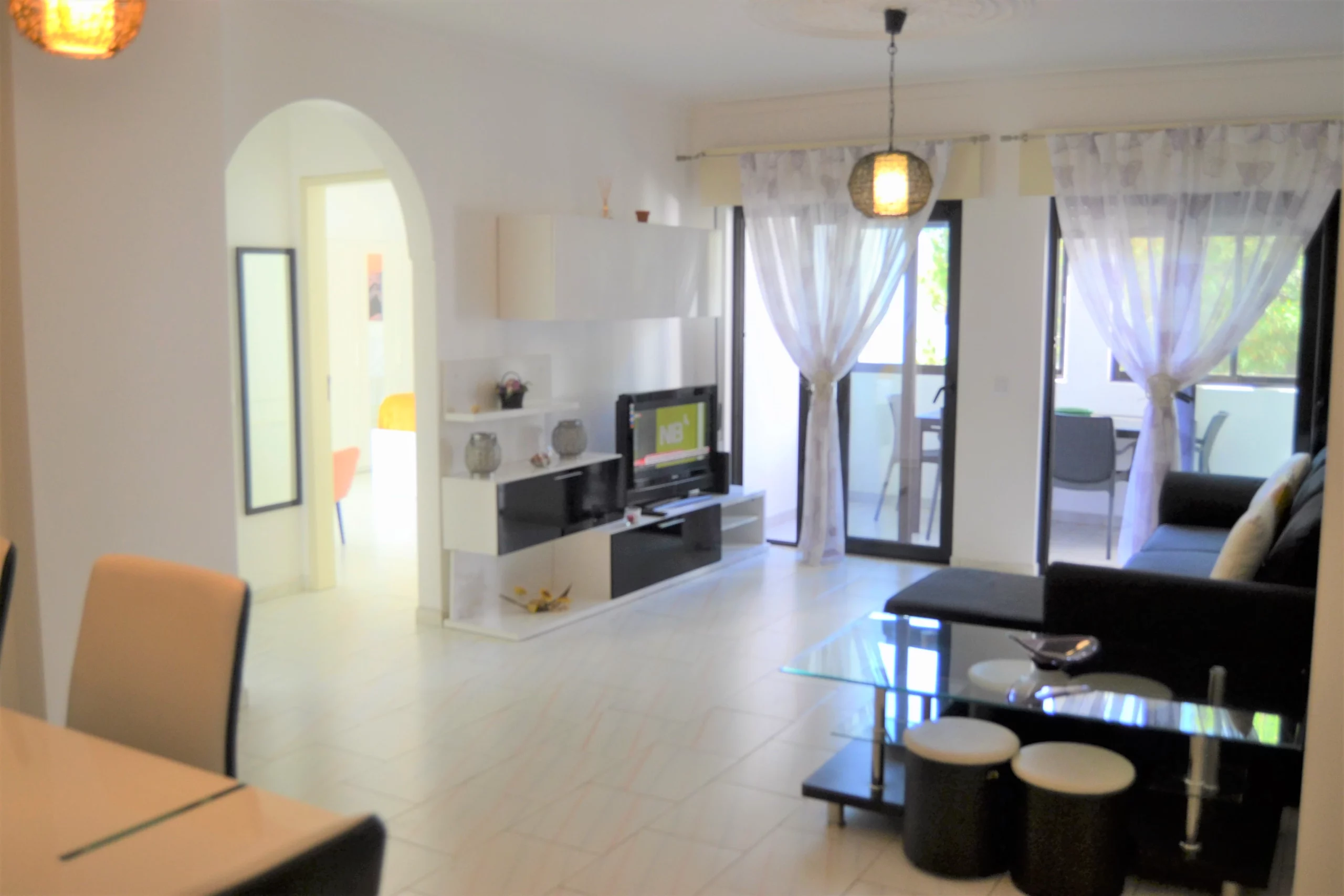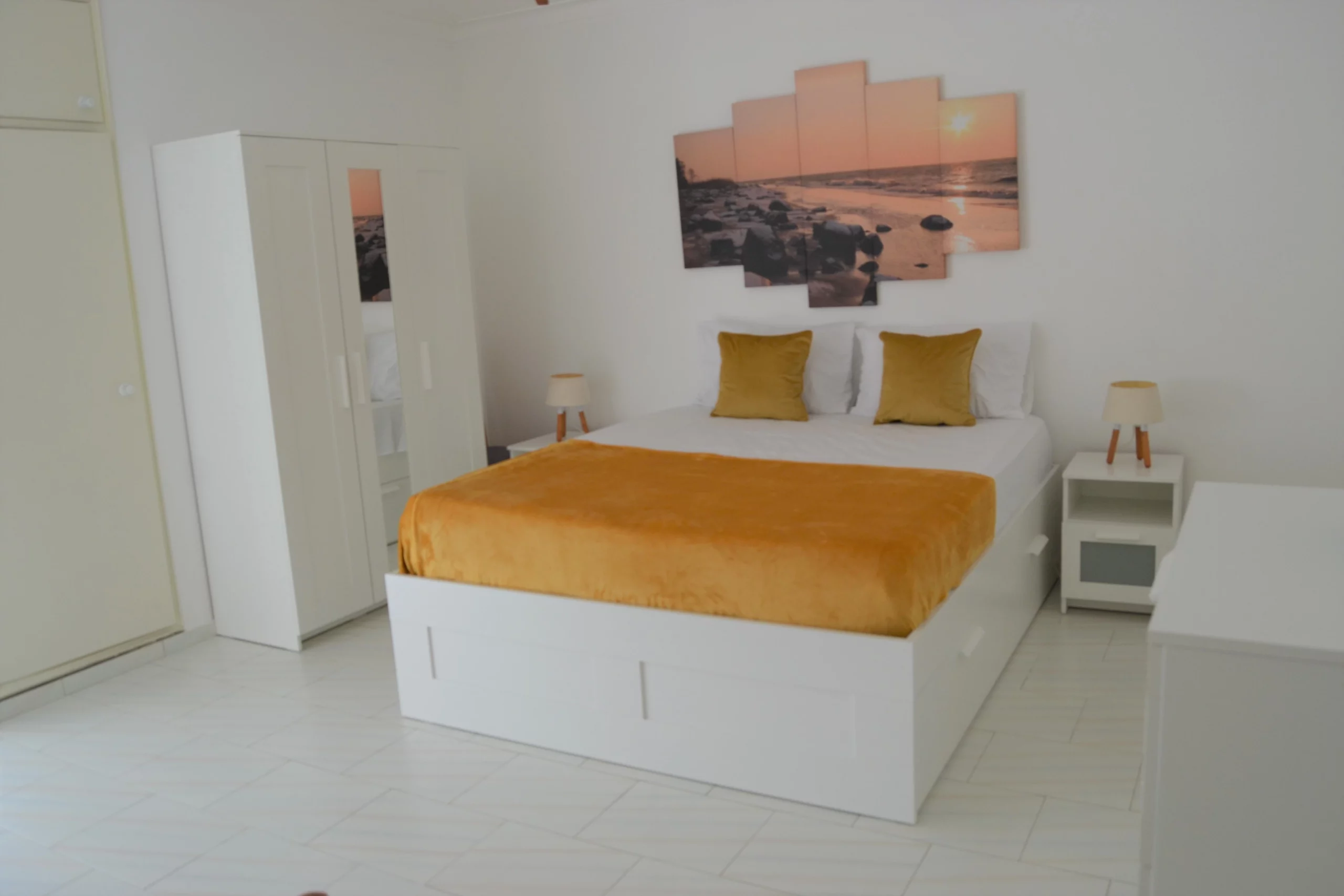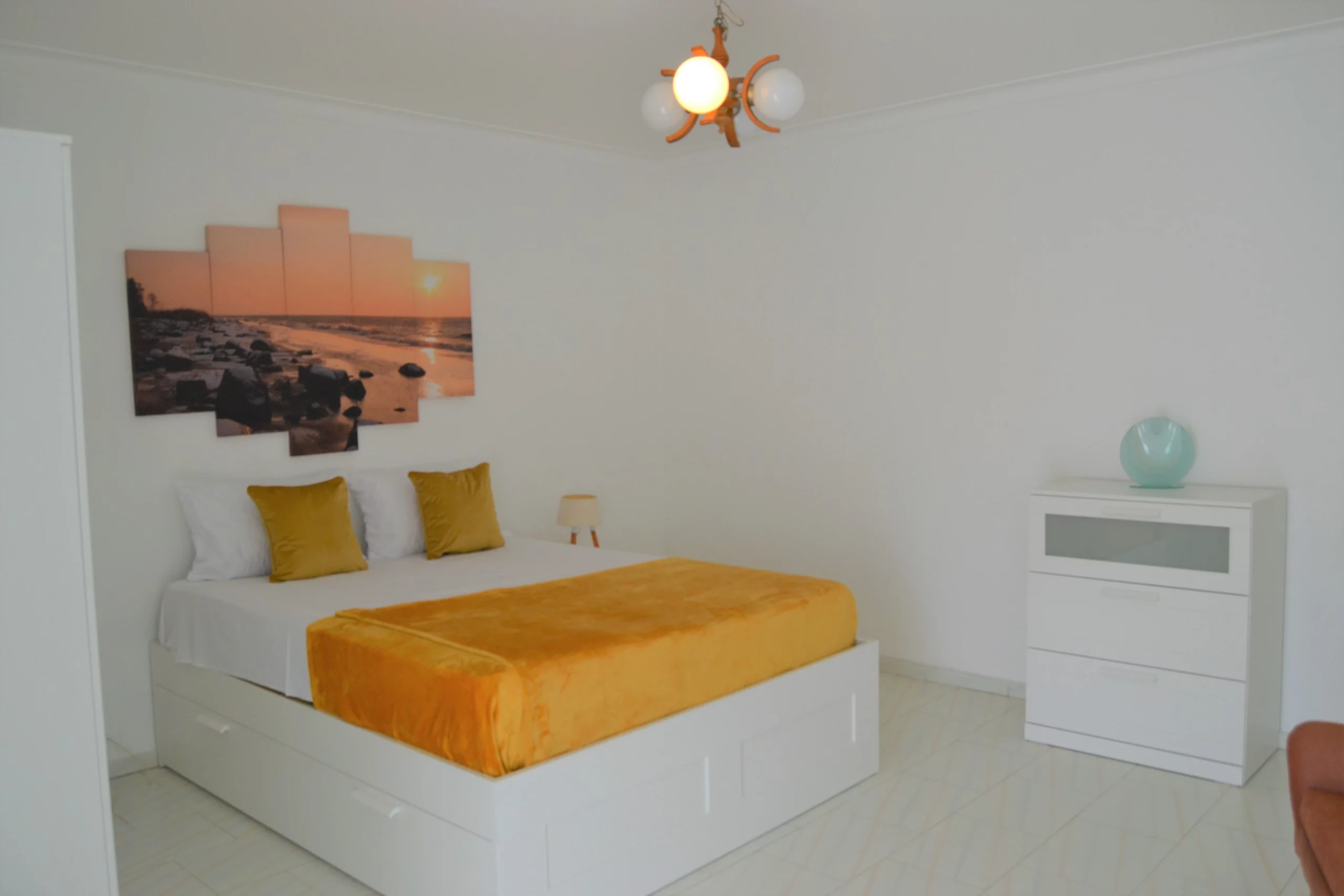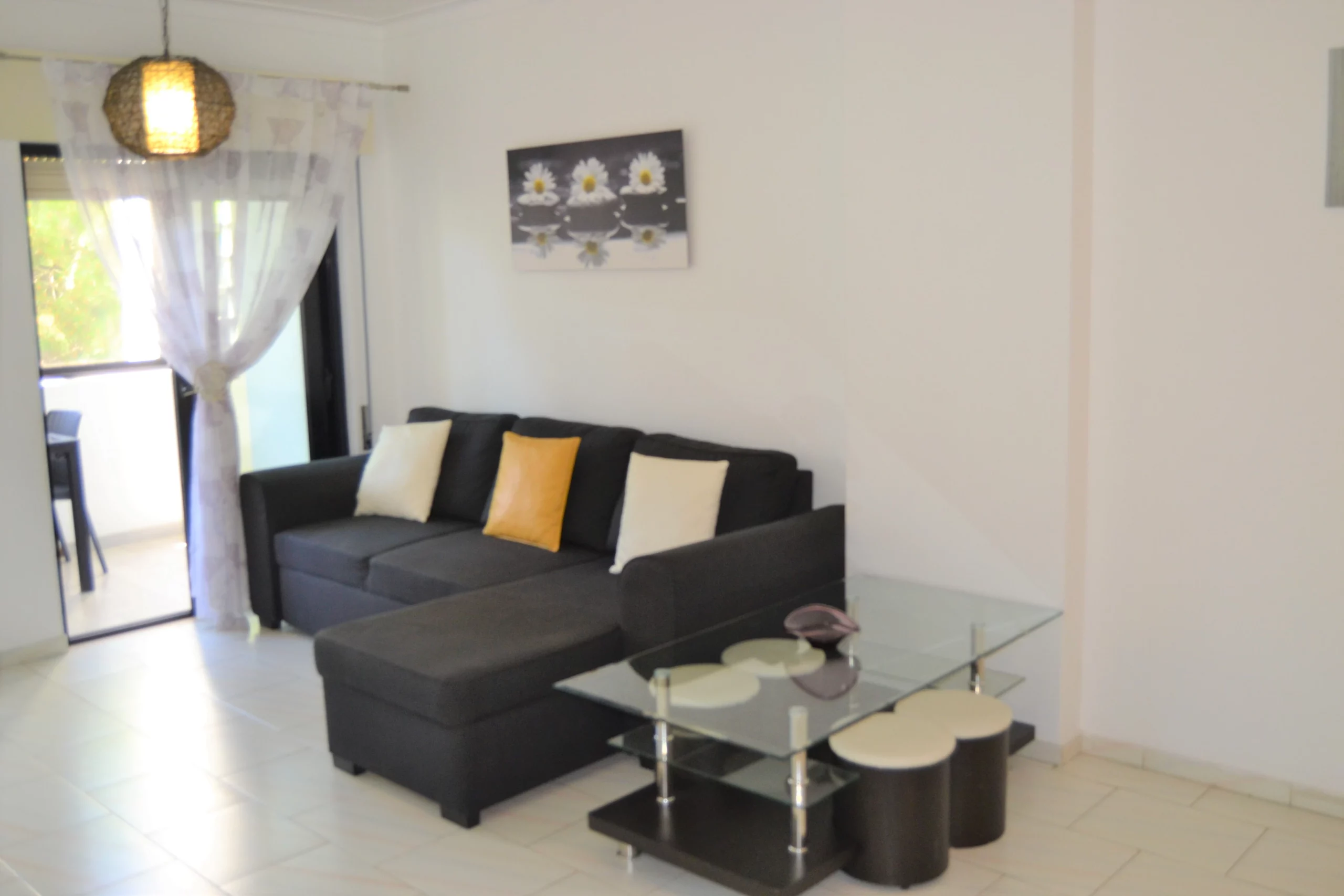 Sala de Estar: Espaçosa e convidativa, a sala de estar é decorada com um toque moderno, equipada com um sofá-cama confortável e uma televisão para os seus momentos de lazer. A sala abre-se para uma varanda, perfeita para desfrutar de uma bebida fresca ou uma refeição ao ar livre.
